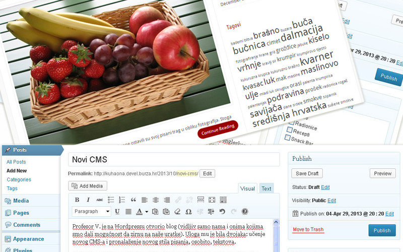 Nakon foto-snimanja prvih recepata idealna prigoda za unos i proučavanje opcija novog CMS-a. Za početak sam pisala tekstove u wordu, pa onda prenosila u sustav. Ikone su prilično slične onima na koje smo navikle, pa i nije bilo nekih posebnih problema. Jedino što je bilo malo teže za otkriti, opcija za prelamanje teksta, odnosno da se samo uvodni tekst u receptu vidi na listingu sadržaja.